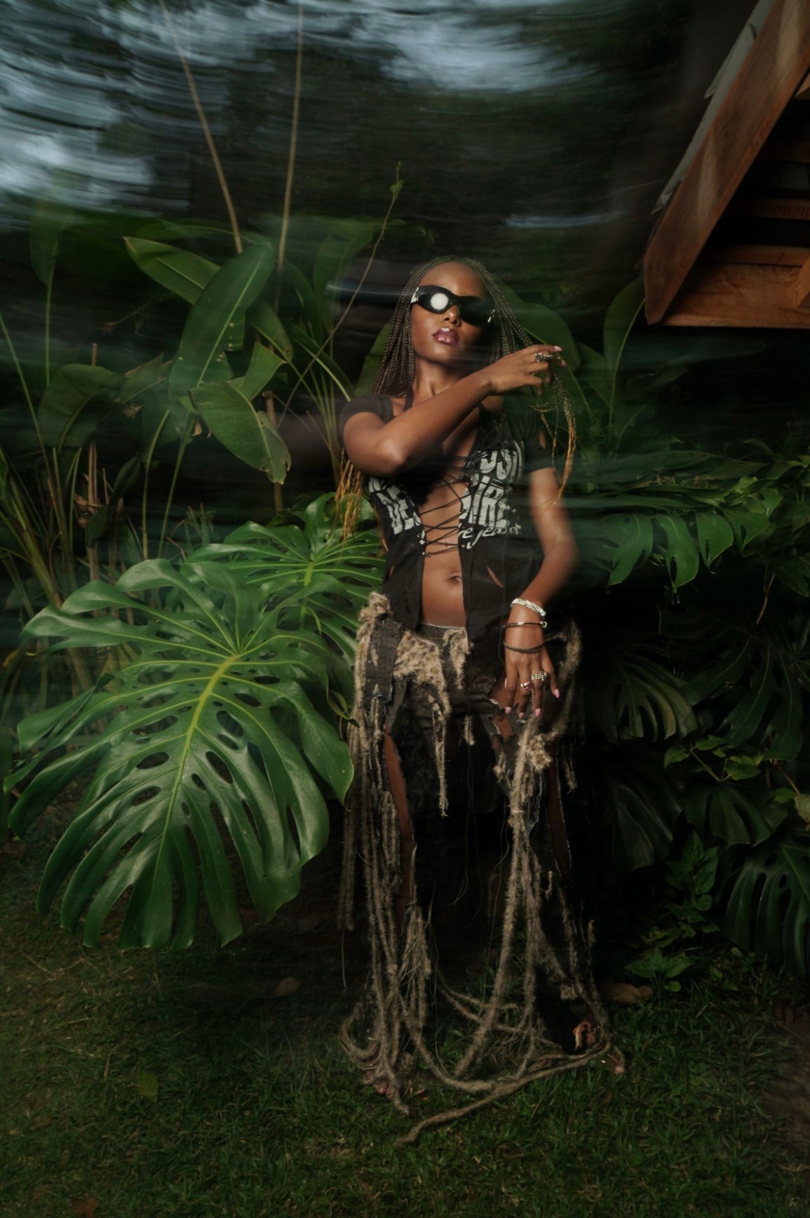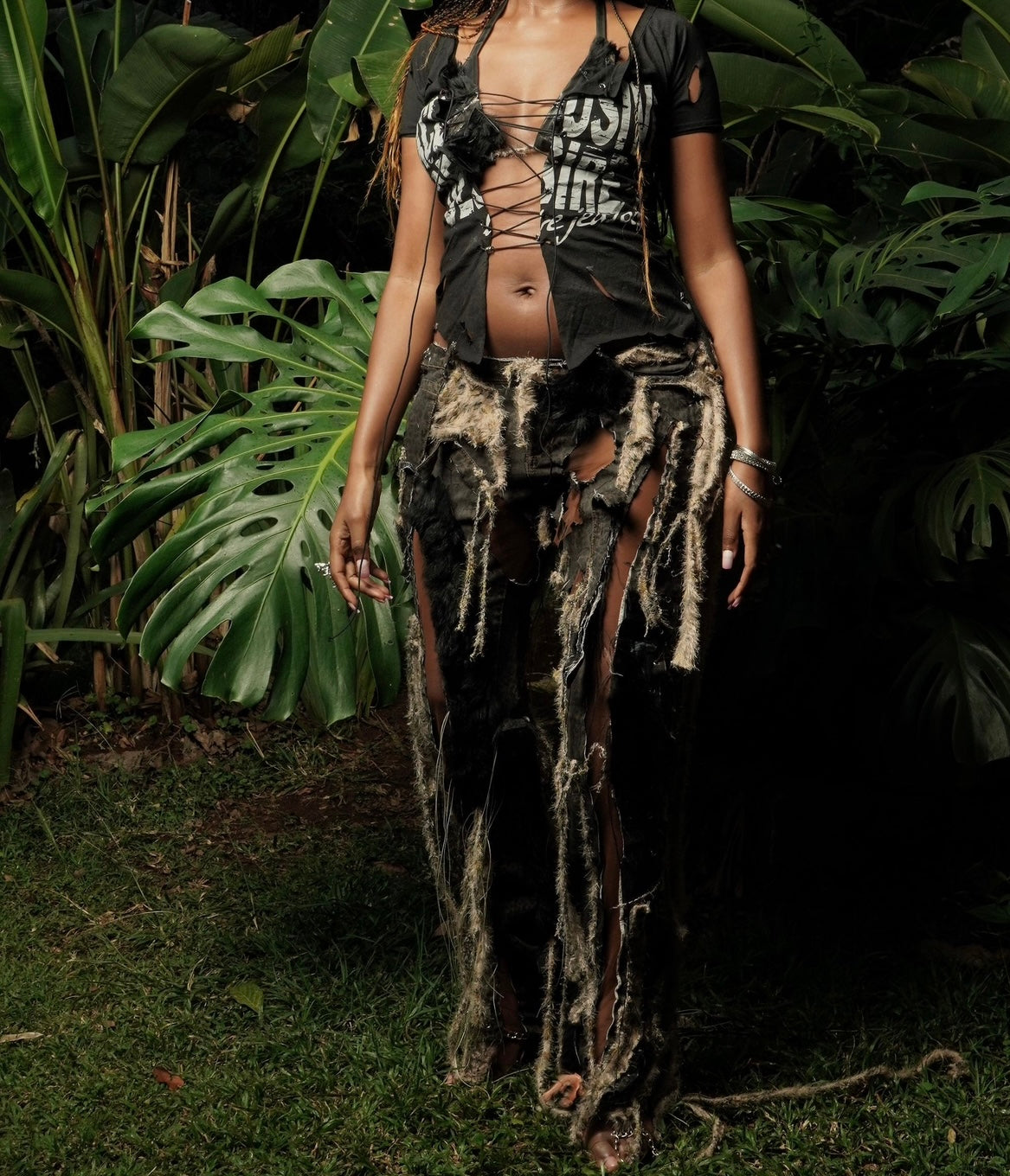 Reworked black animal Print pants with sheer skintone lace cutouts, Distressed knits and lace details
